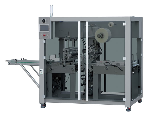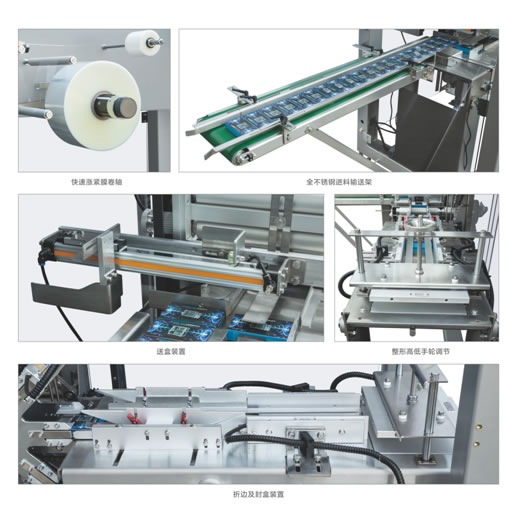本機(jī)適用于各行業(yè)中的單件盒式物品的薄膜自動(dòng)包裝(帶金拉線)。本機(jī)整體機(jī)架采用碳鋼噴塑、落地多開安全門結(jié)構(gòu),采用平推式推盒結(jié)構(gòu),更換模具簡單,調(diào)節(jié)距離多處采用手搖式調(diào)節(jié)尺寸,大大節(jié)省換模具時(shí)間,固定膜處采用氣漲軸輥固定,使換膜更簡單、快速。