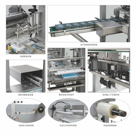 2.更換少量模具配件即可包裝不同尺寸的物品,采用全新設(shè)計(jì)的快速調(diào)節(jié)結(jié)構(gòu),使更換模具配件更加簡(jiǎn)單快捷,將傳統(tǒng)機(jī)四小時(shí)的更換模具時(shí)間縮短為只需現(xiàn)在30分鐘。